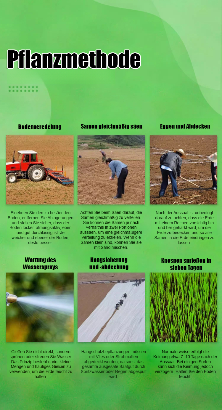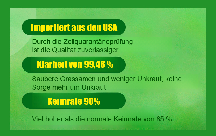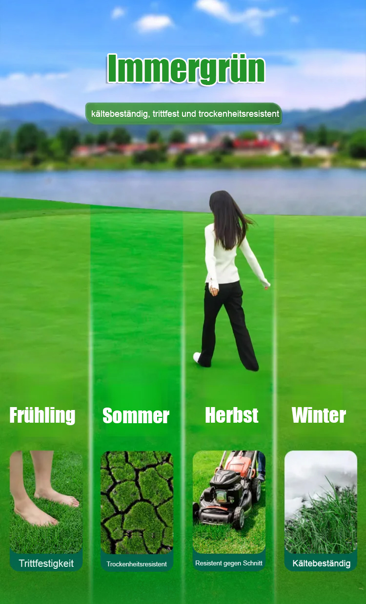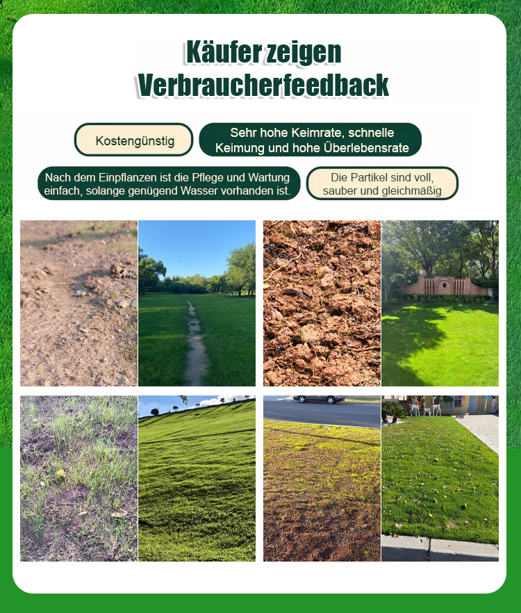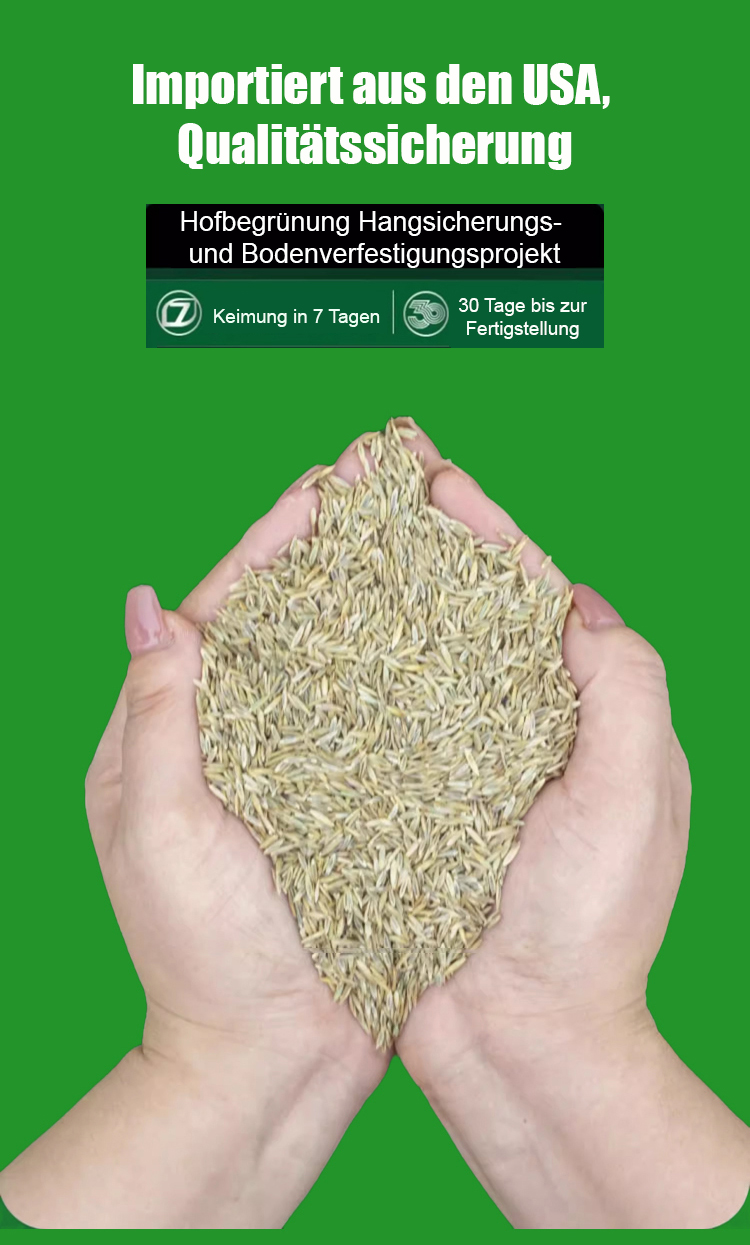 In nur 45 Tagen erhalten Sie einen dichten, weichen Teppichrasen. Eine einzige Packung reicht aus, um satte 60 Quadratmeter zu bepflanzen! Kein Mähen mehr im Sommer nötig, und auch im Herbst und Winter bleibt Ihr Rasen strahlend grün. 🛡️ Wenn Sie nicht zufrieden sind, erstatten wir Ihnen den vollen Kaufpreis zurück!